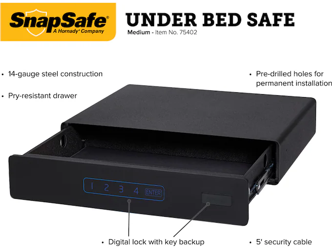 The SnapSafe Under Bed Safe is the perfect for keeping firearms close and secure. This large under bed safe will fit the majority of home defense weapons with room to spare. Featuring an electronic lock with an additional security cable firearms will be safely locked and ready in a time of need.